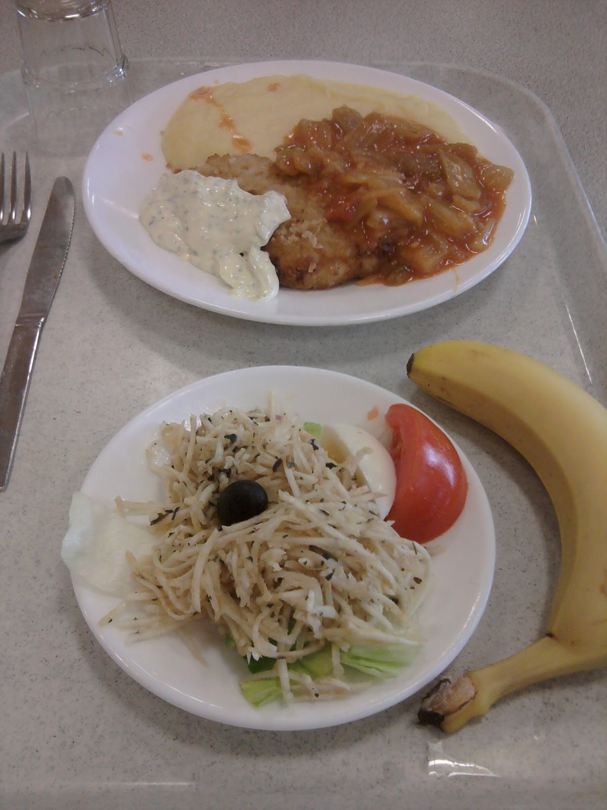 Mashed potatoes, fish with tartar sauce, ratatouille. Someone wanted to know if this is the school's cafeteria/dinning hall, it is.